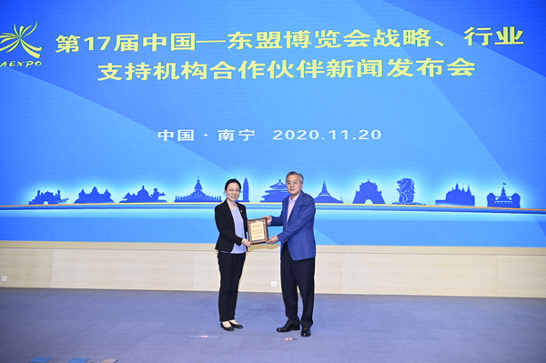 11月20日,第17屆中國—東盟博覽會戰(zhàn)略、行業(yè)、支持機構(gòu)合作伙伴新聞發(fā)布會在南寧舉行,13家企業(yè)成為第17屆東博會戰(zhàn)略、行業(yè)、支持機構(gòu)合作伙伴。廣西壯族自治區(qū)副主席周紅波出席發(fā)布會并向合作伙伴代表頒發(fā)榮譽牌匾。廣西壯族自治區(qū)人民政府副秘書長楊斌主持發(fā)布會。中國—東盟博覽會秘書處副秘書長胡志崇、范隆海參加發(fā)布會。