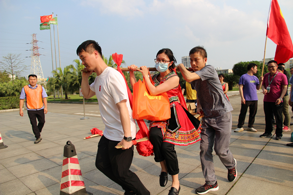 第三關(guān)“我愛兩面針——產(chǎn)品選送”,考驗(yàn)的是團(tuán)隊(duì)協(xié)同作戰(zhàn)能力。參賽隊(duì)員們按照訂單要求,選取對應(yīng)的兩面針產(chǎn)品,由兩名隊(duì)員用扁擔(dān)抬一名身著民族服裝的女員工進(jìn)行產(chǎn)品配送,繞過障礙,到達(dá)終點(diǎn)——“勞動創(chuàng)造幸?!?。