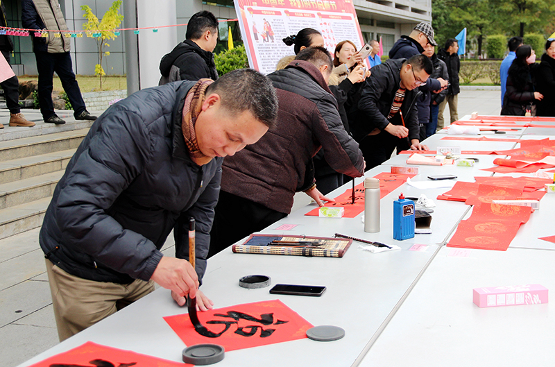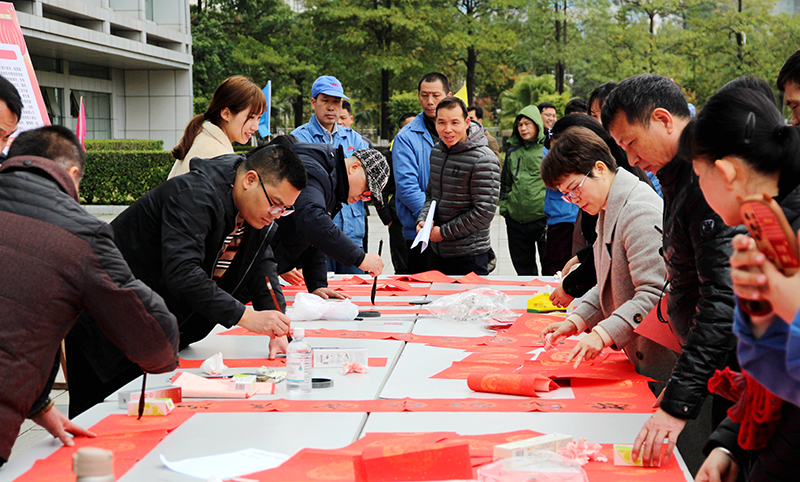 公司工會(huì)特邀廣西書法家協(xié)會(huì)會(huì)員蔡家捷、王日東,柳州書法家協(xié)會(huì)會(huì)員戴曉斌、江波四位書法大師到場(chǎng),為廣大職工寫春聯(lián)、送“?!弊?,大家喜氣洋洋接“?!?,臉上洋溢著幸福的笑容。