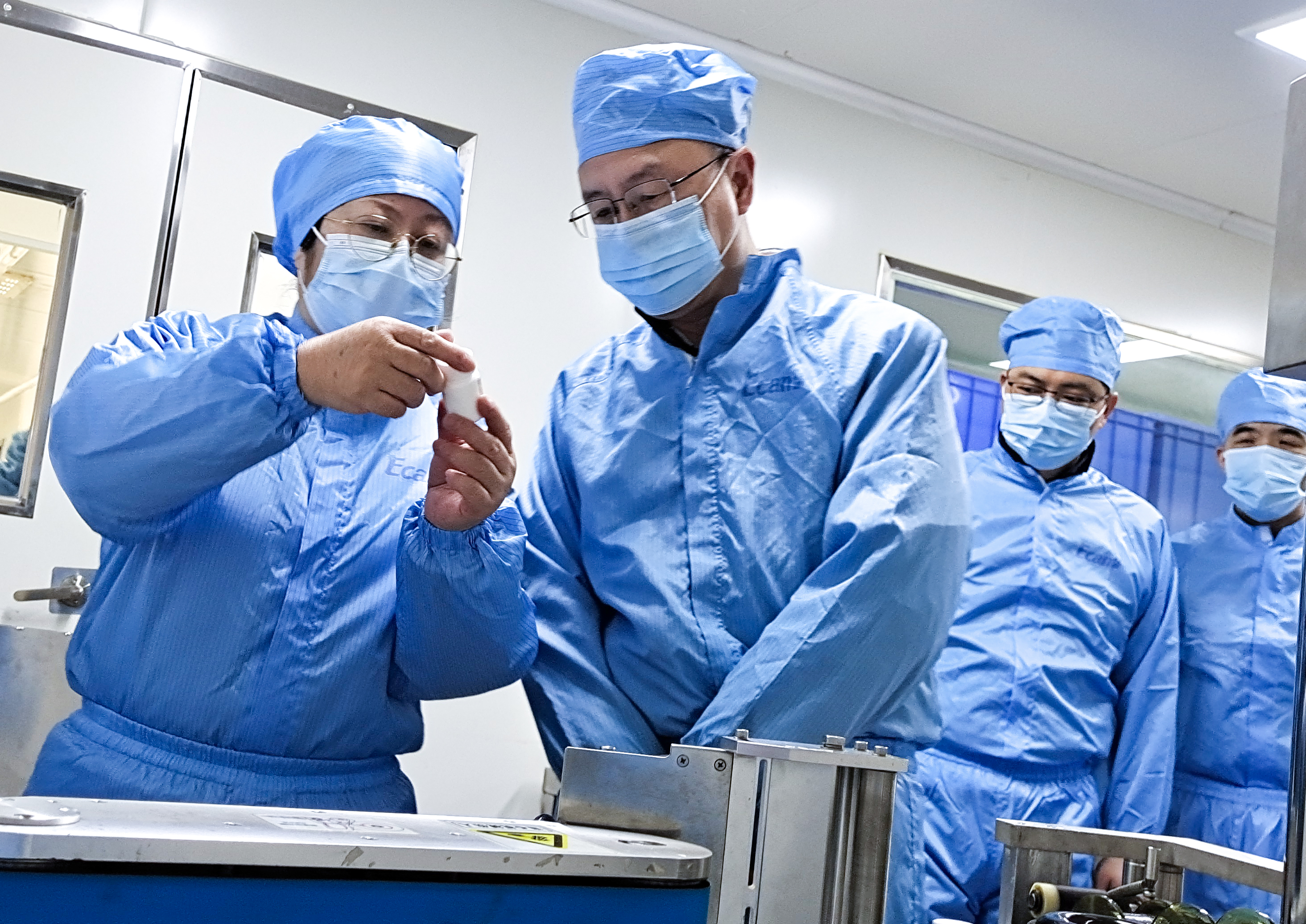 1月9日廣西藥監(jiān)局柳州檢查分局負責(zé)人周德源(左二)帶隊檢查億康藥業(yè)布洛芬片復(fù)產(chǎn)進度