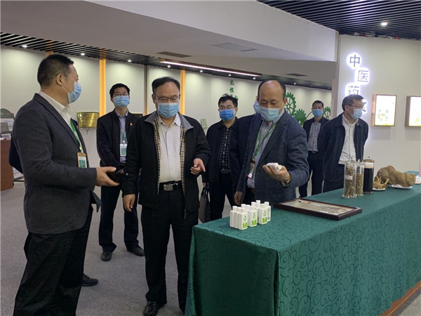 曹坤華廳長(zhǎng)(左三)了解兩面針青蒿抑菌免洗洗手液產(chǎn)品情況