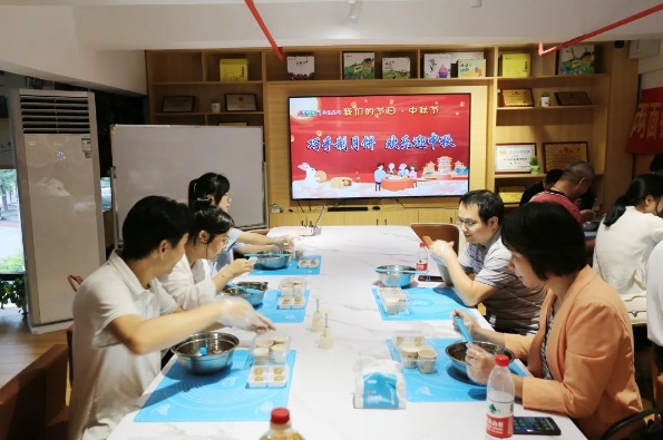 和面、壓皮、包餡、模具按壓、烘烤、刷蛋液……這是9月14日中秋節(jié)民俗文化的體驗現(xiàn)場,20名公司員工圍桌而座開展月餅DIY活動,在煙火日常的儀式感中創(chuàng)造美味。當一個個熱氣騰騰、香味撲鼻的月餅新鮮出爐,他們滿心期待的目光頓時充滿成就感。有些員工忍不住即刻品嘗自己的勞動成果,全然“忘記”手作老師“新出爐的月餅先放置兩天,回油更好吃”的叮囑。此次活動讓員工更好地學習、傳承手工文化制作技藝,大家在歡聲笑語中更加增進了友誼。