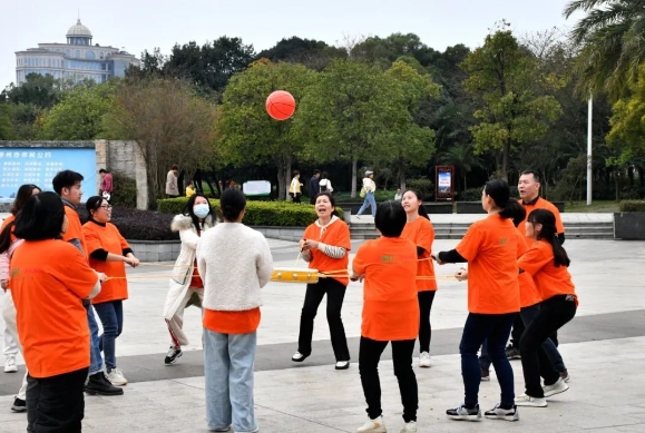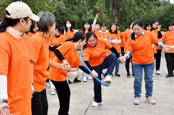 團隊趣味競技賽馬上要開始啦!“一、二,轉(zhuǎn)身;三、四擺臂……”大家跟著口令進行了充分的熱身。隨后,采取隨機方式,人員分成四組,每組16名隊員,在各自隊長的帶領(lǐng)下,各組分別開展了穿越呼拉圈、珠行萬里、同心擊鼓等趣味競技項目。大家手拉手相互協(xié)助,讓呼啦圈快速在隊列中進行傳遞;大家肩并肩巡回接力,讓三個小球在凹槽板上向前飛馳;10名隊員拉鼓繩、6名隊員護衛(wèi),大家同心擊鼓,鼓聲催人拼搏奮進……現(xiàn)場加油聲、歡笑聲、喝彩聲不斷,大家在運動中享受歡樂、展現(xiàn)風采,增進了友誼,增強了凝聚力。