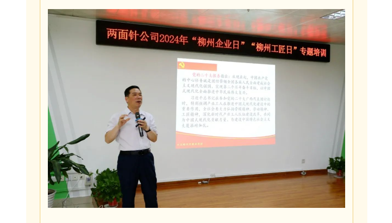 為深入學(xué)習宣傳貫徹習近平新時代中國特色社會主義思想,貫徹落實習近平總書記關(guān)于大力弘揚勞模精神、勞動精神、工匠精神的重要指示精神,在4月26日“柳州企業(yè)日”“柳州工匠日”到來之際,公司于4月24日下午在兩面針學(xué)堂組織了2024年“學(xué)理論強思想 鉆業(yè)務(wù)促提升”主題培訓(xùn)(第四期:思政教育),邀請中共柳州市委講師團團長陳謹禮作《以中國式現(xiàn)代化全面推進中華民族偉大復(fù)興——大力弘揚勞模精神、勞動精神、工匠精神》的主題宣講,公司黨委副書記、紀委書記覃永強與60余名干部職工一同到場聆聽。