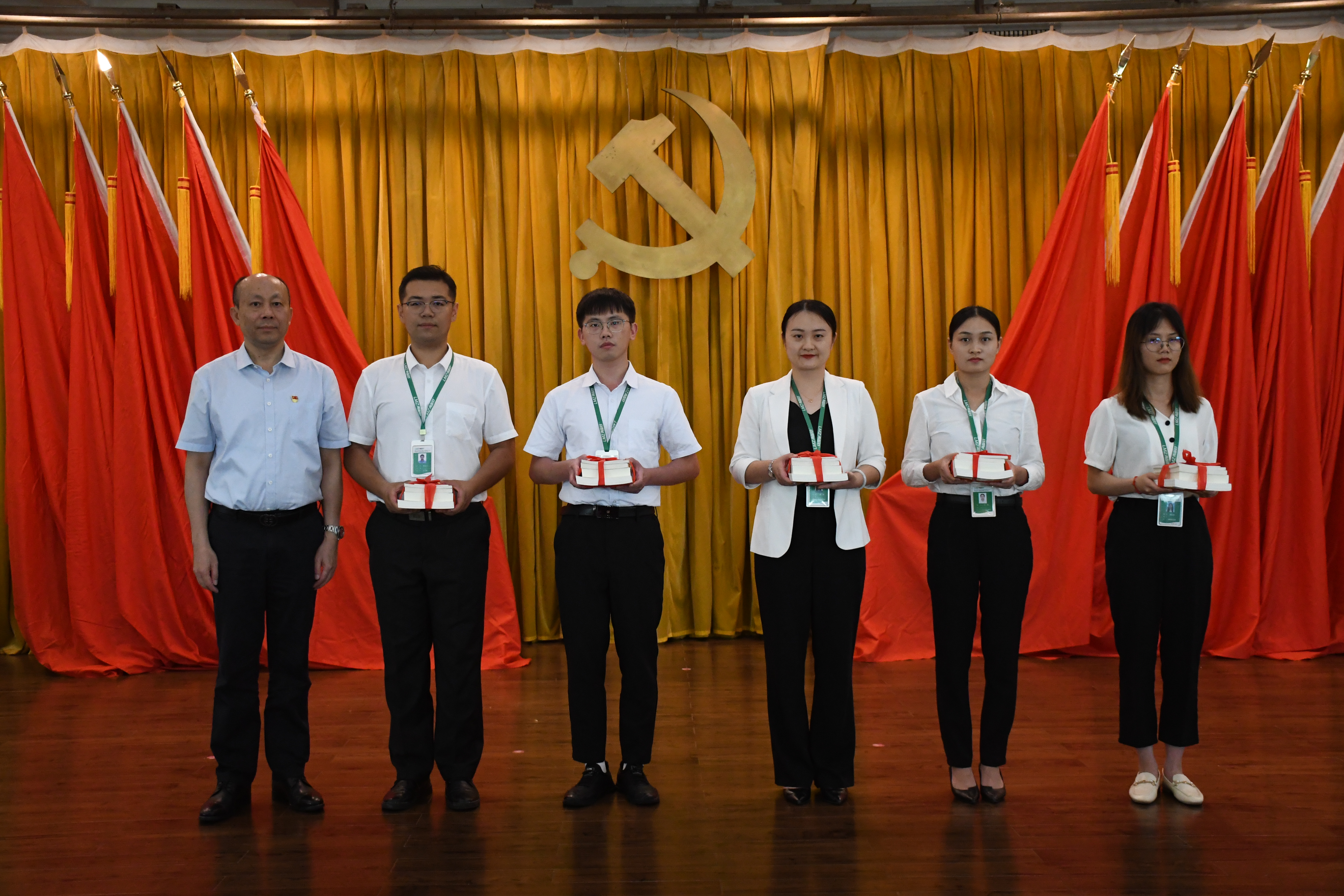 在雄壯的國歌聲中,會議正式拉開帷幕。會議首先舉行了新黨員入黨宣誓儀式,公司黨委書記、董事長林鉆煌向新黨員頒發(fā)黨章、授予黨員徽章、贈送學(xué)習(xí)書籍,鼓勵他們加強學(xué)習(xí),不斷提升,成為一名合格的中共黨員。