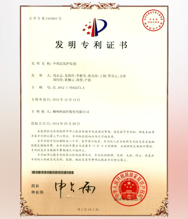 中藥洗發(fā)護(hù)發(fā)劑-專利證書
